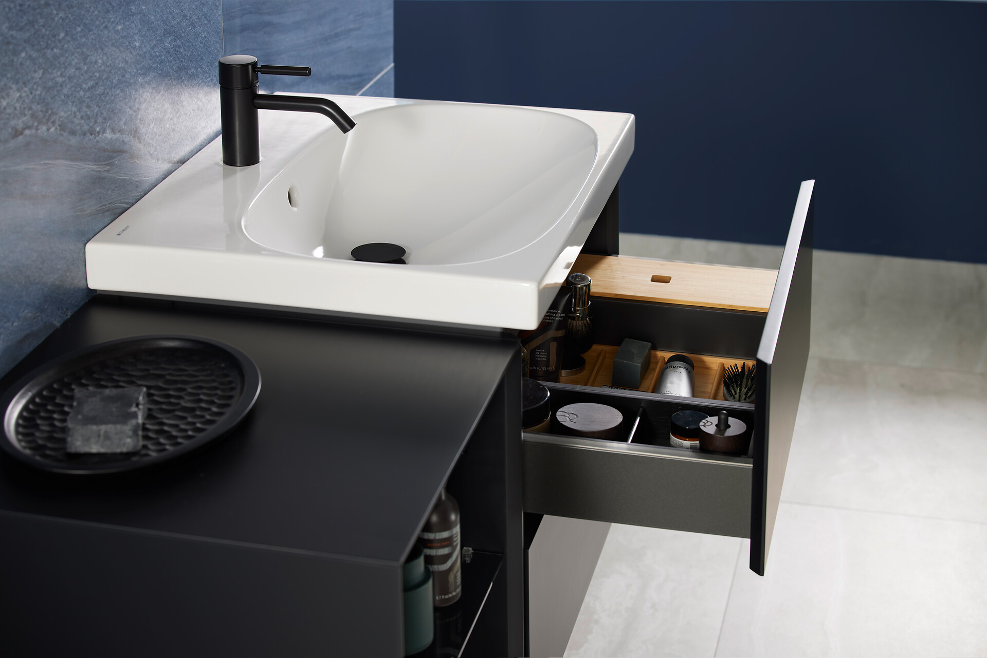 Die Badserie Geberit ONE vereint sanitärtechnisches Know-how mit vielseitiger Designkompetenz. Die Waschtische haben wahlweise einen klassischen oder einen horizontalen Ablauf, der höchste Designansprüche mit einzigartiger Funktionalität verbindet. Die Waschtischkeramiken sind mit und ohne Ablage, als Möbelwaschtisch oder Aufsatzwaschtisch in Schalenform oder rechteckig erhältlich. Die Fronten der Waschtischunterschränke lassen sich mit dem Push-to-open-Mechanismus öffnen.